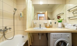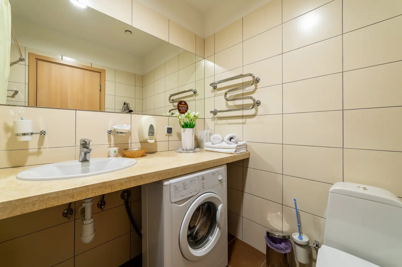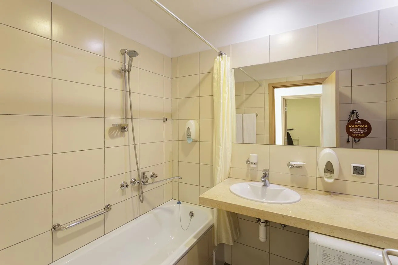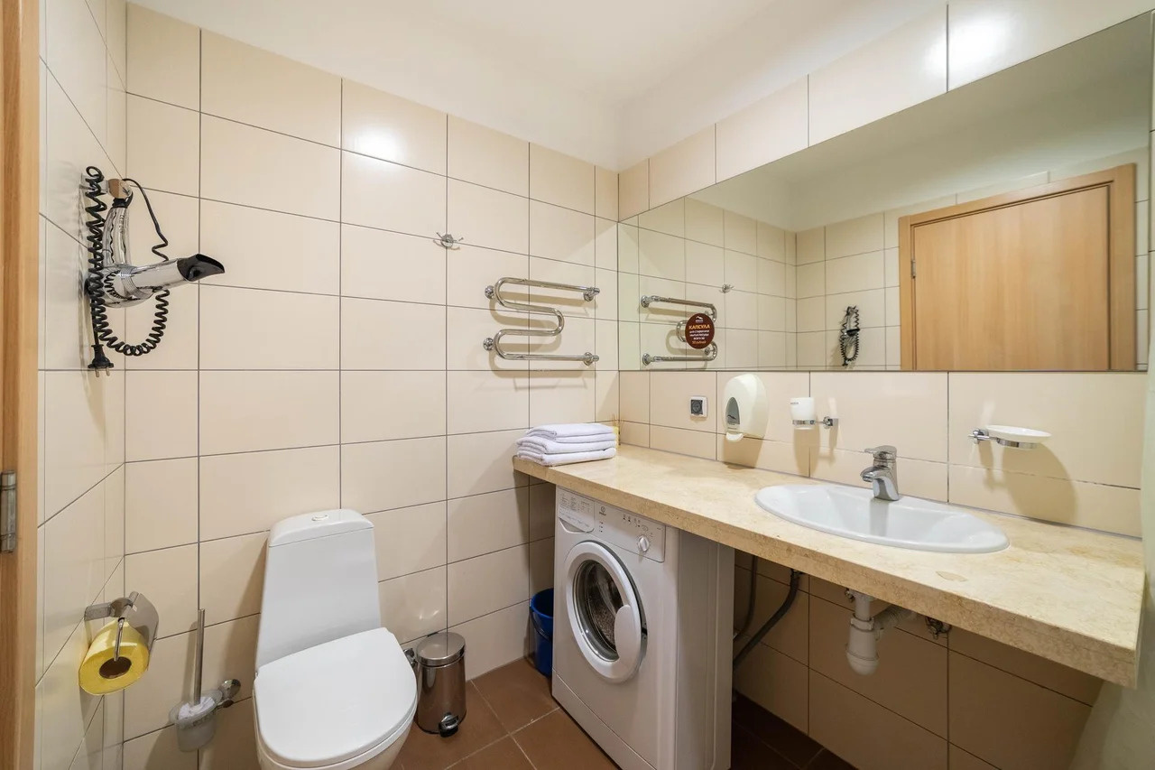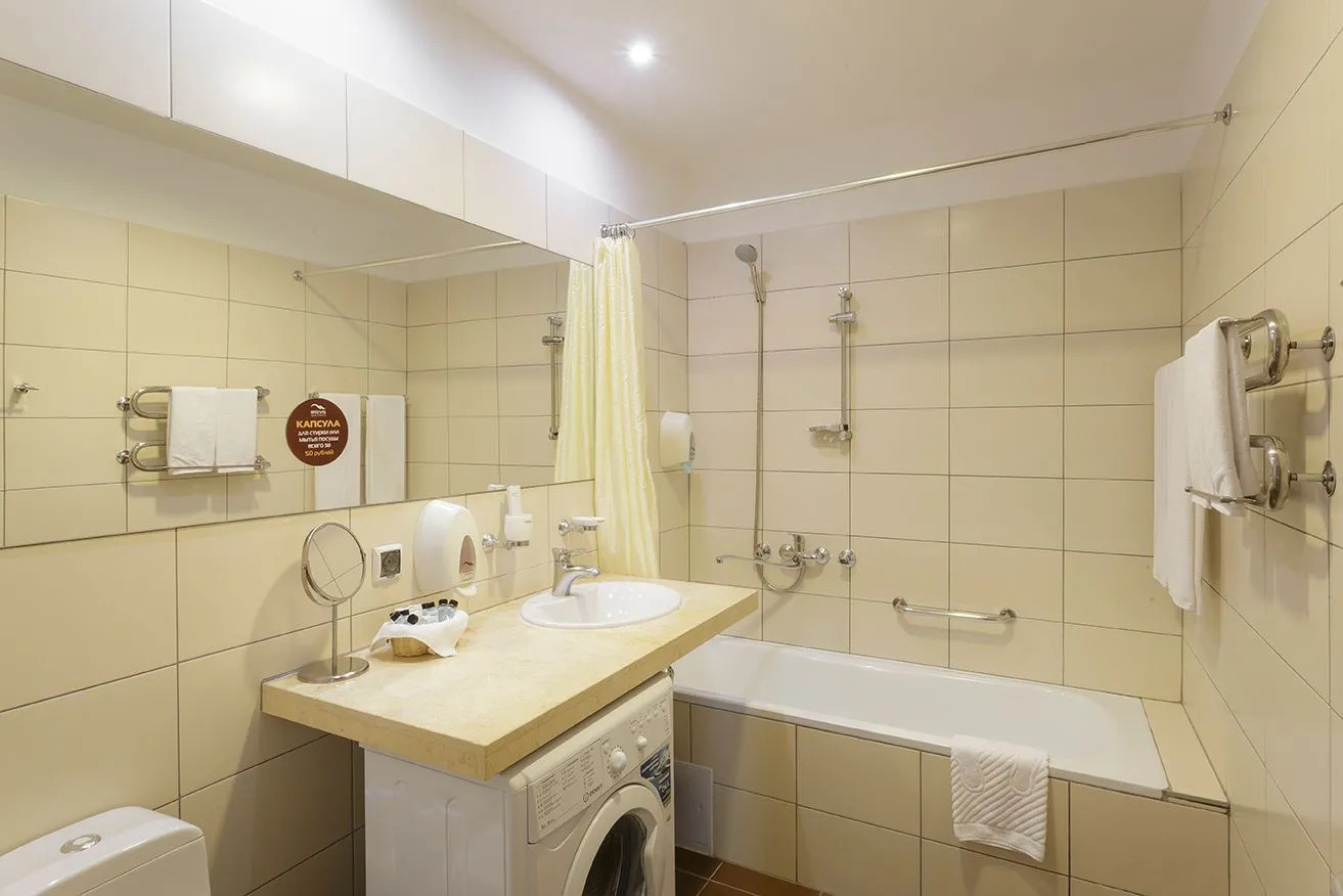 Кровать отличная!Бельё чистое и меняют регулярно.В ванной комнате всё было и техника вся исправно работала.