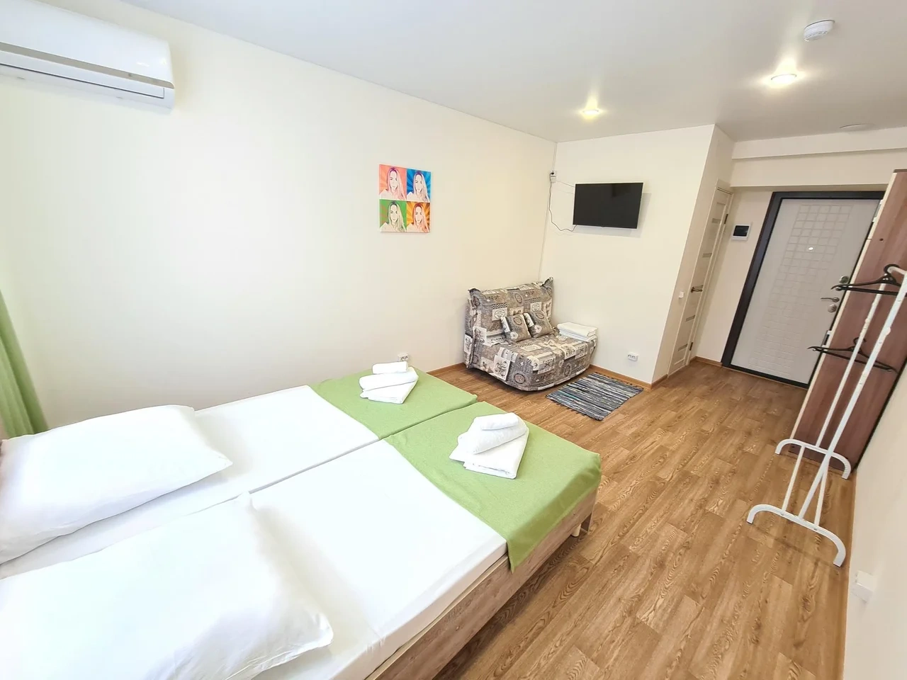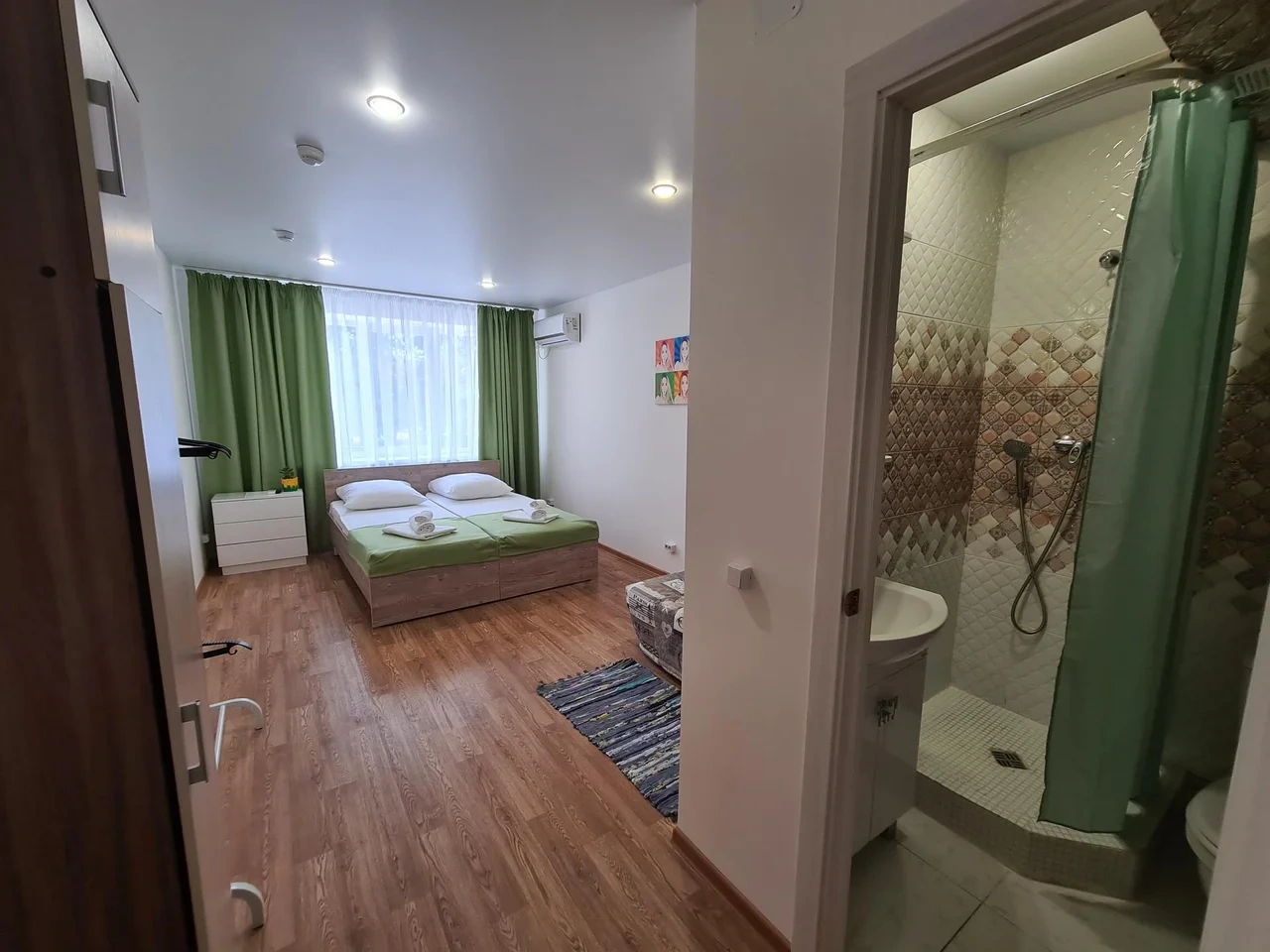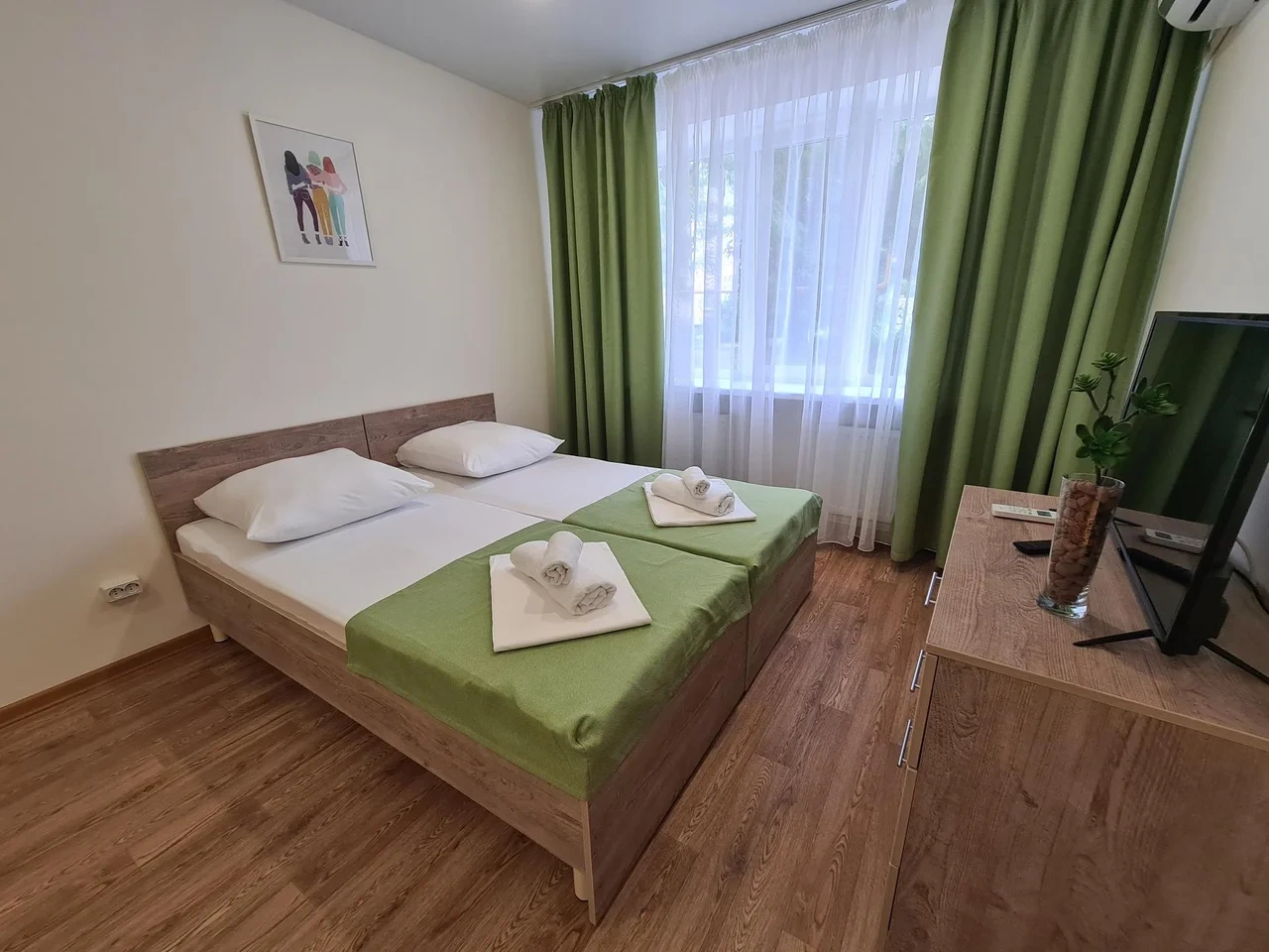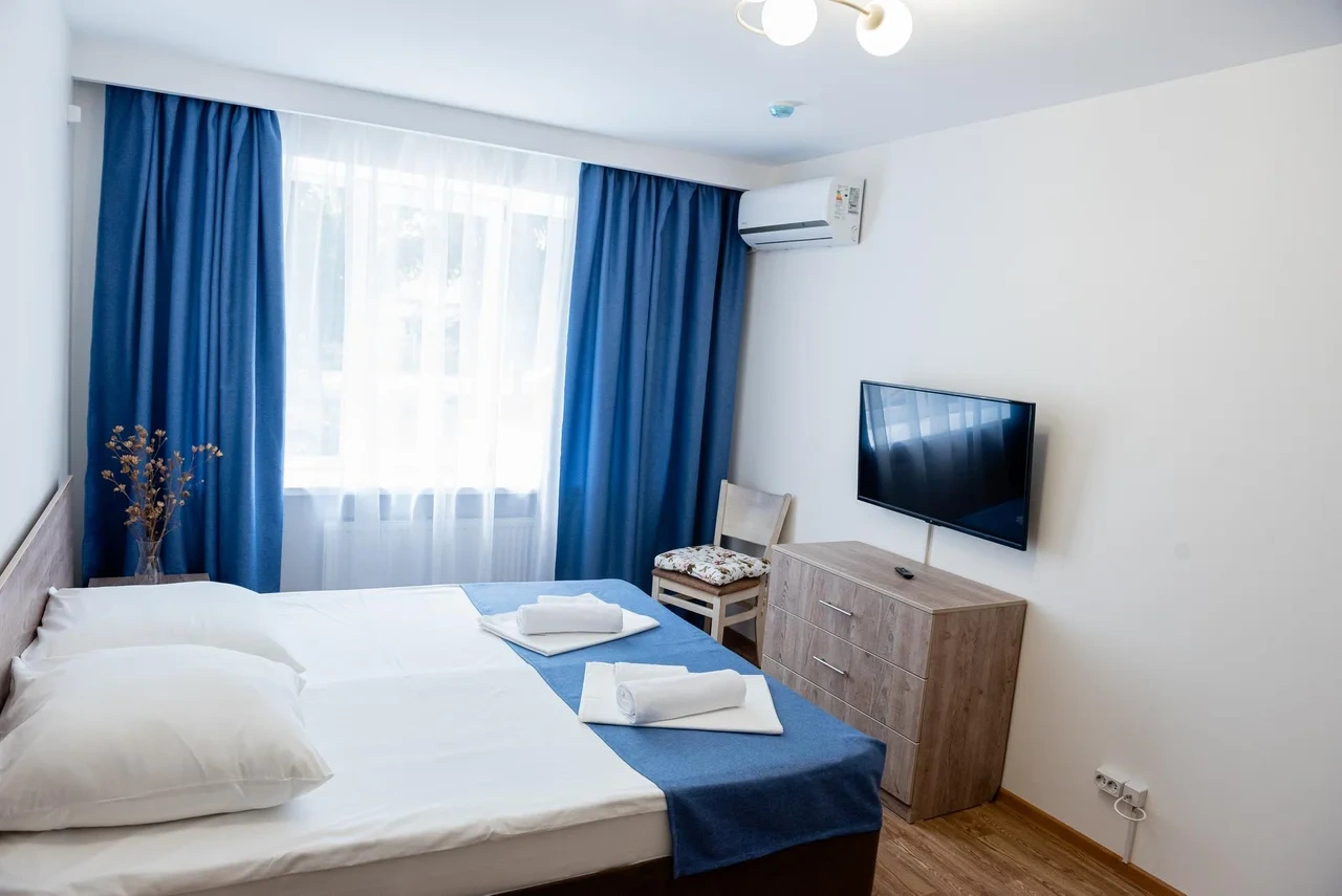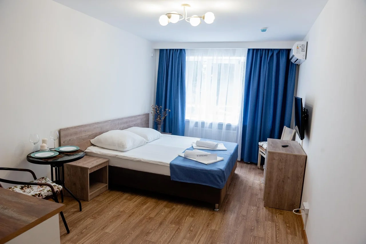 номер с двуспальной кроватью, smart tv,в номере кондиционер душ и санузел. номер находится на первом этаже. Кухня и обеденная зона с телевизором находится отдельно.