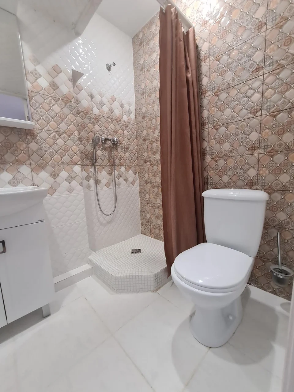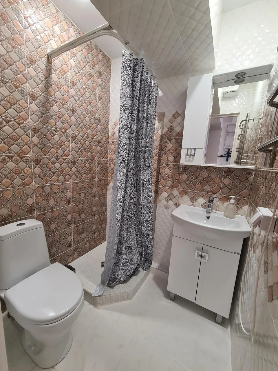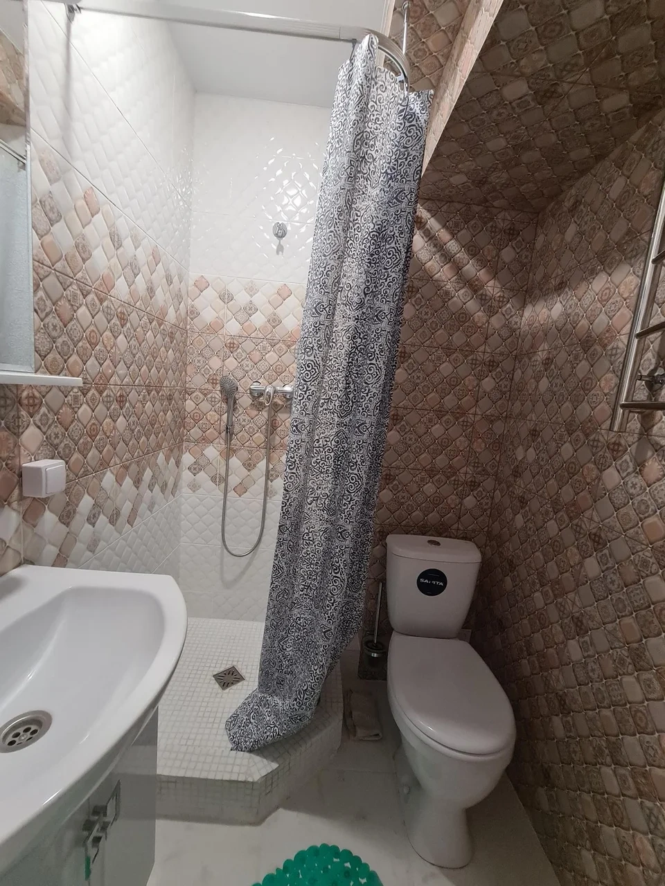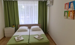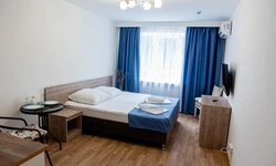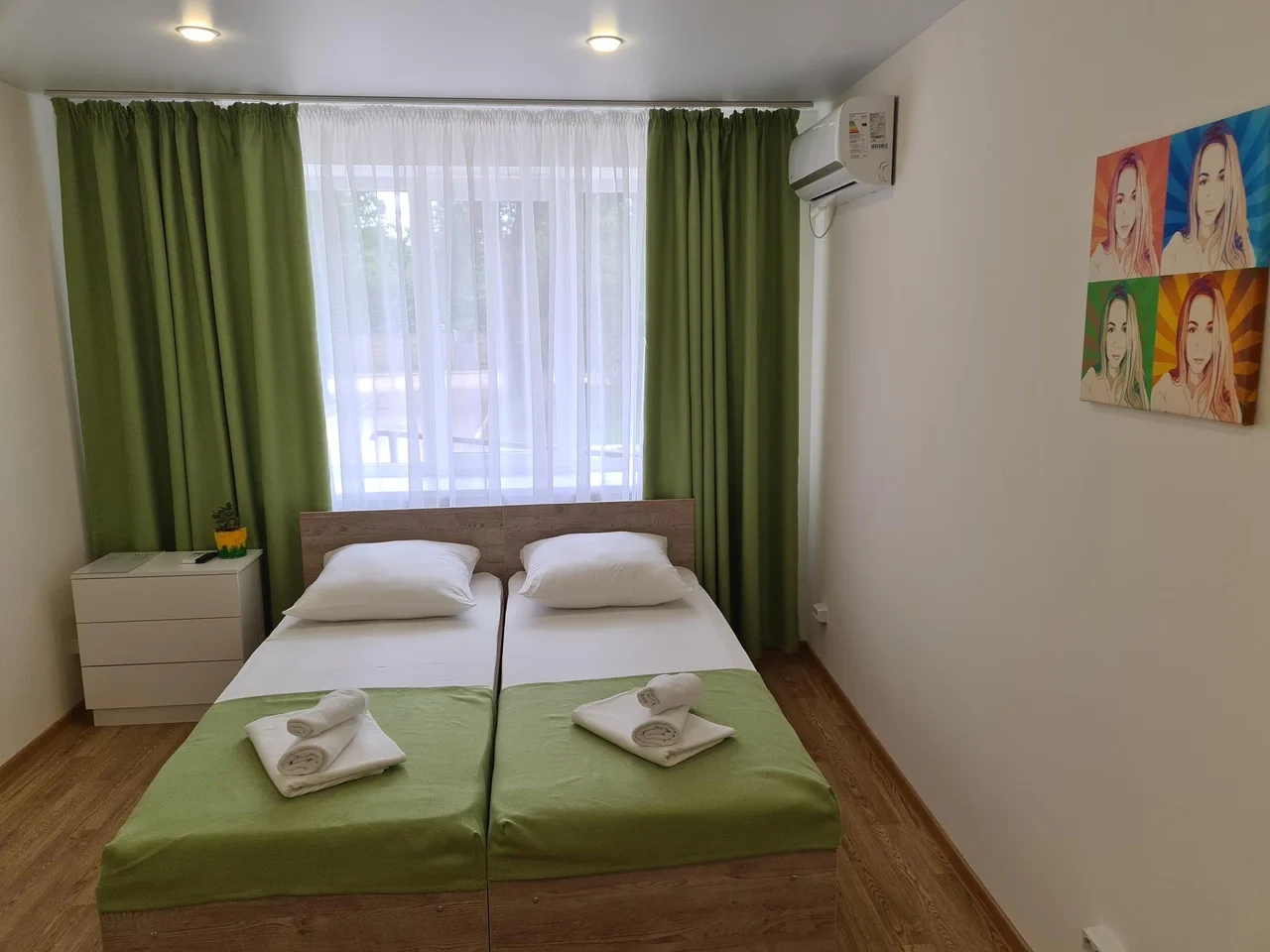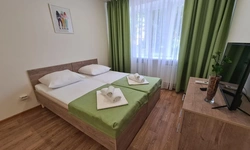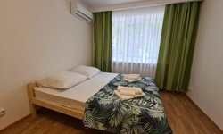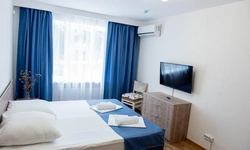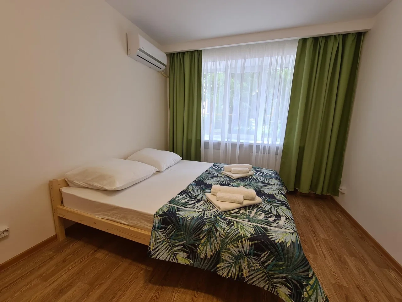 номер с двуспальной кроватью, smart tv,в номере кондиционер душ и санузел. номер находится на первом этаже. Кухня и обеденная зона с телевизором находится отдельно.