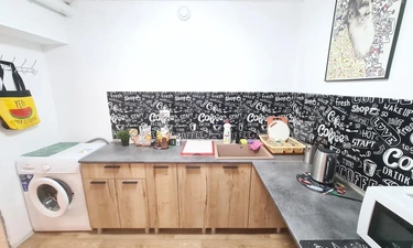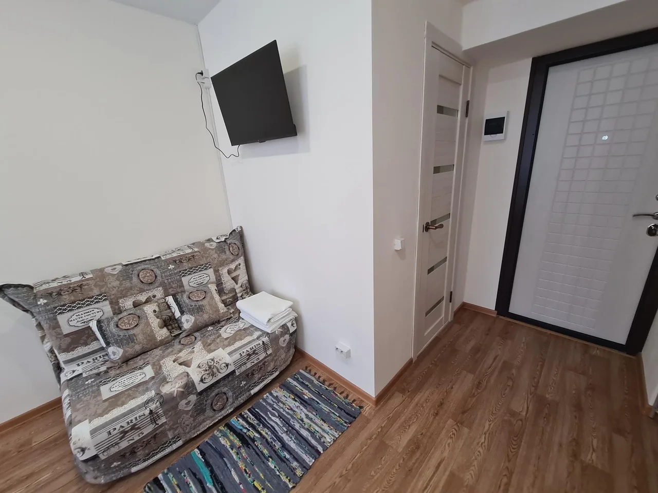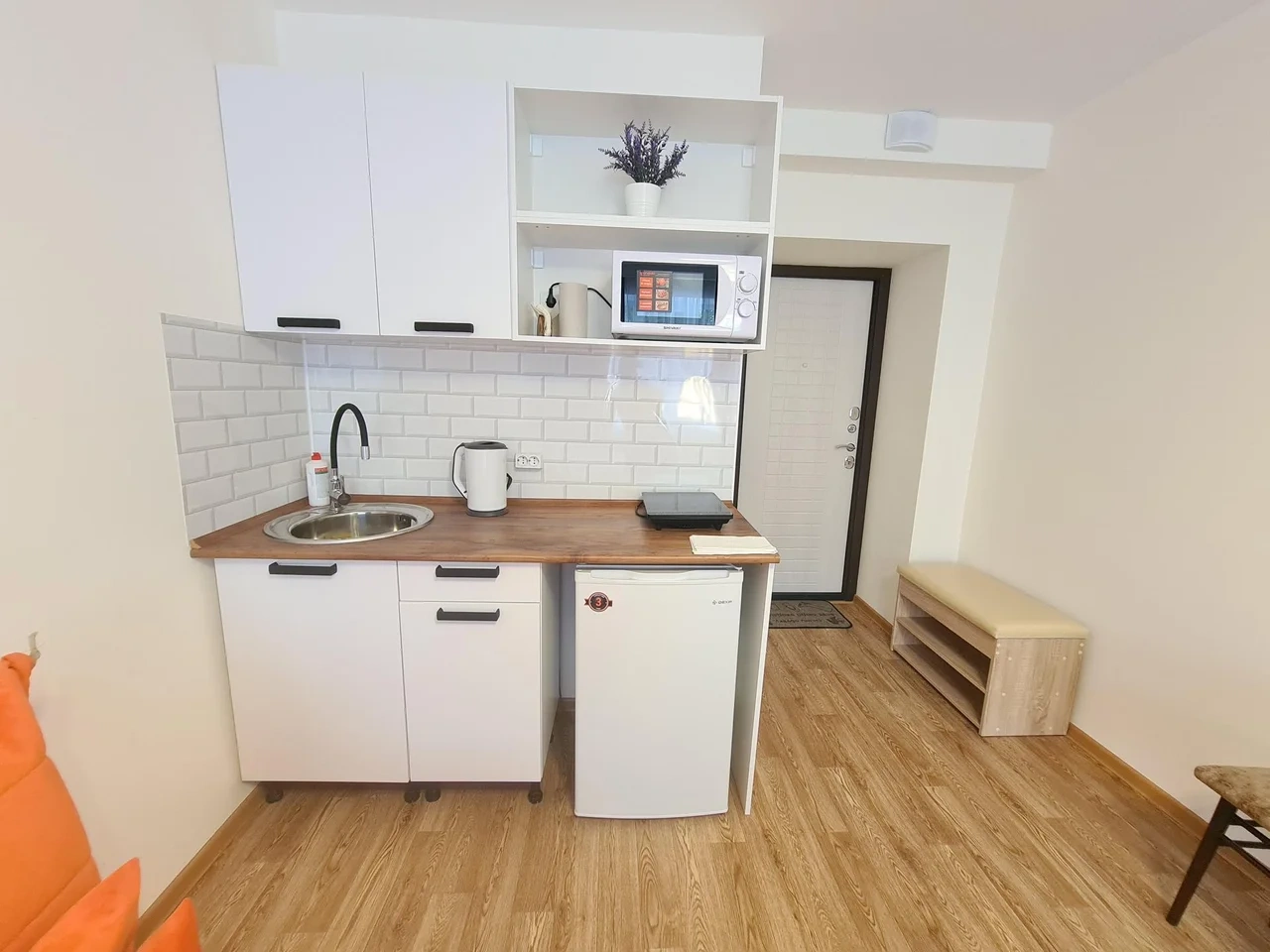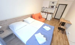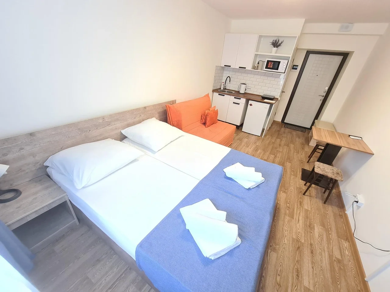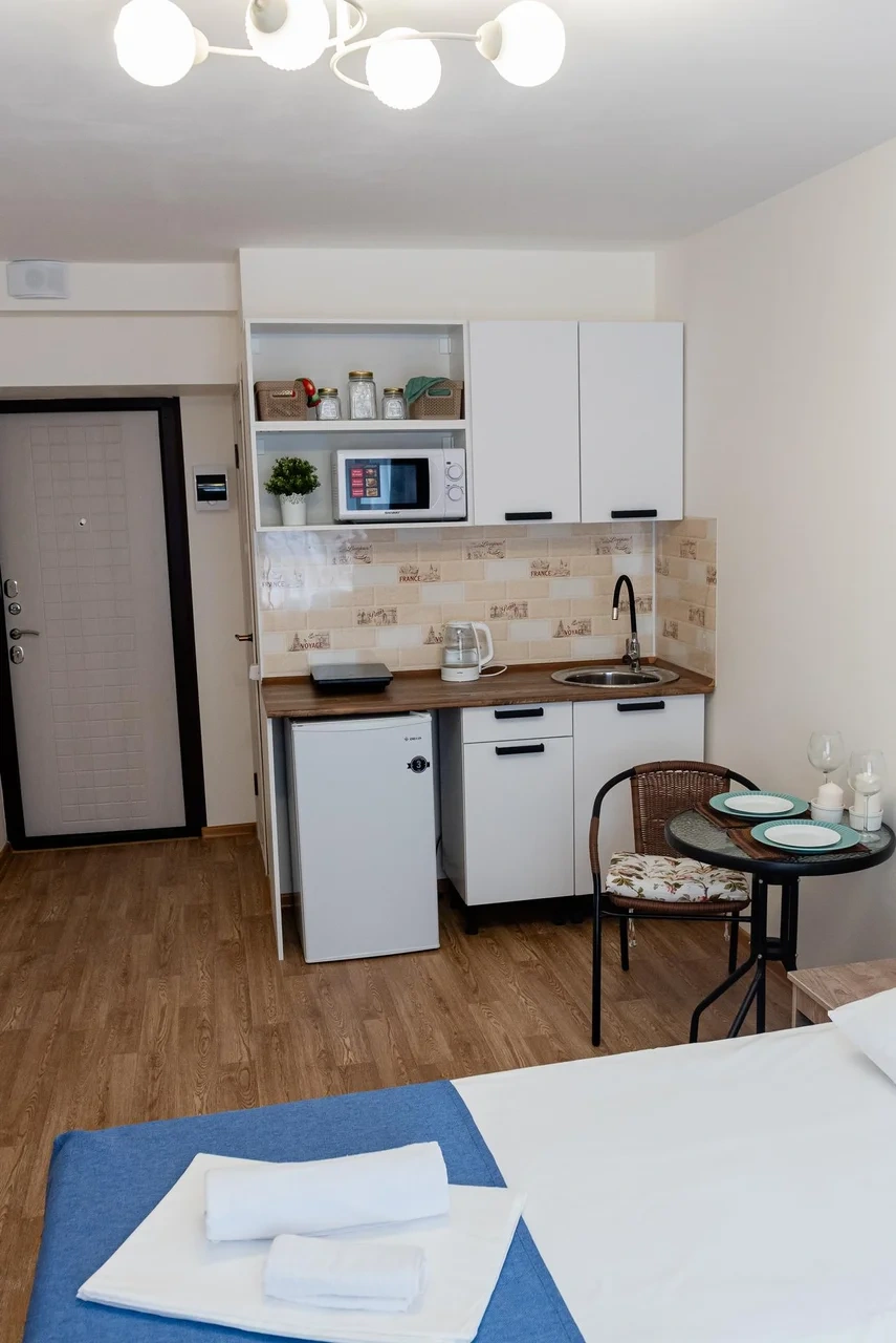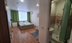 В номере есть мини кухня туалет и душ. постельное белье и посуда тоже в наличие в номере. А также Smart TV? кондиционер, холодильник , бесплатный интернет. Номер находится на 1 этаже.