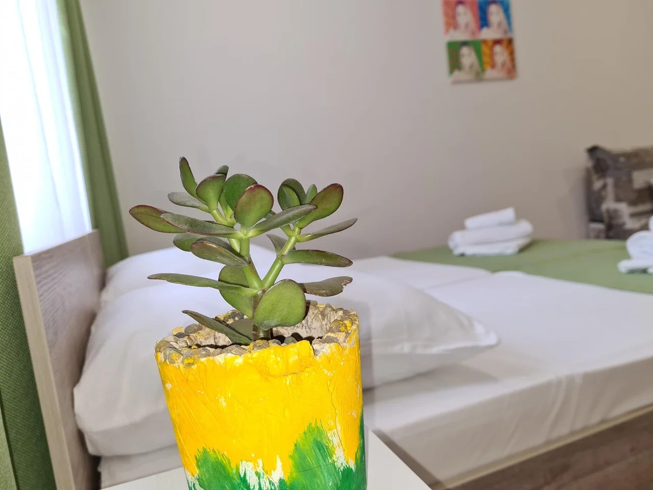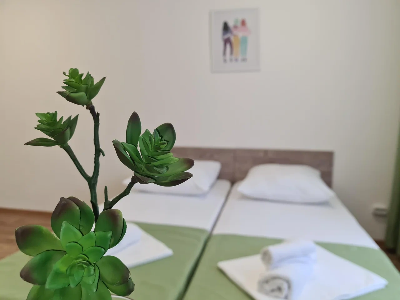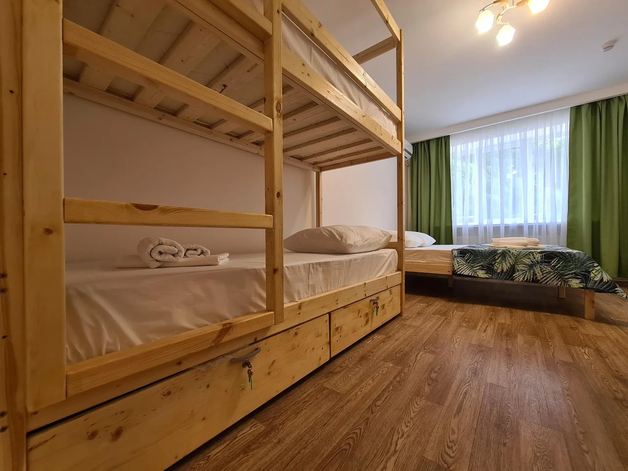 В номере большая двух спальная кровать , двух ярусная кровать. smart tv? кондиционер .душ и туалет. Кухня и обеденная зона находится отдельно.