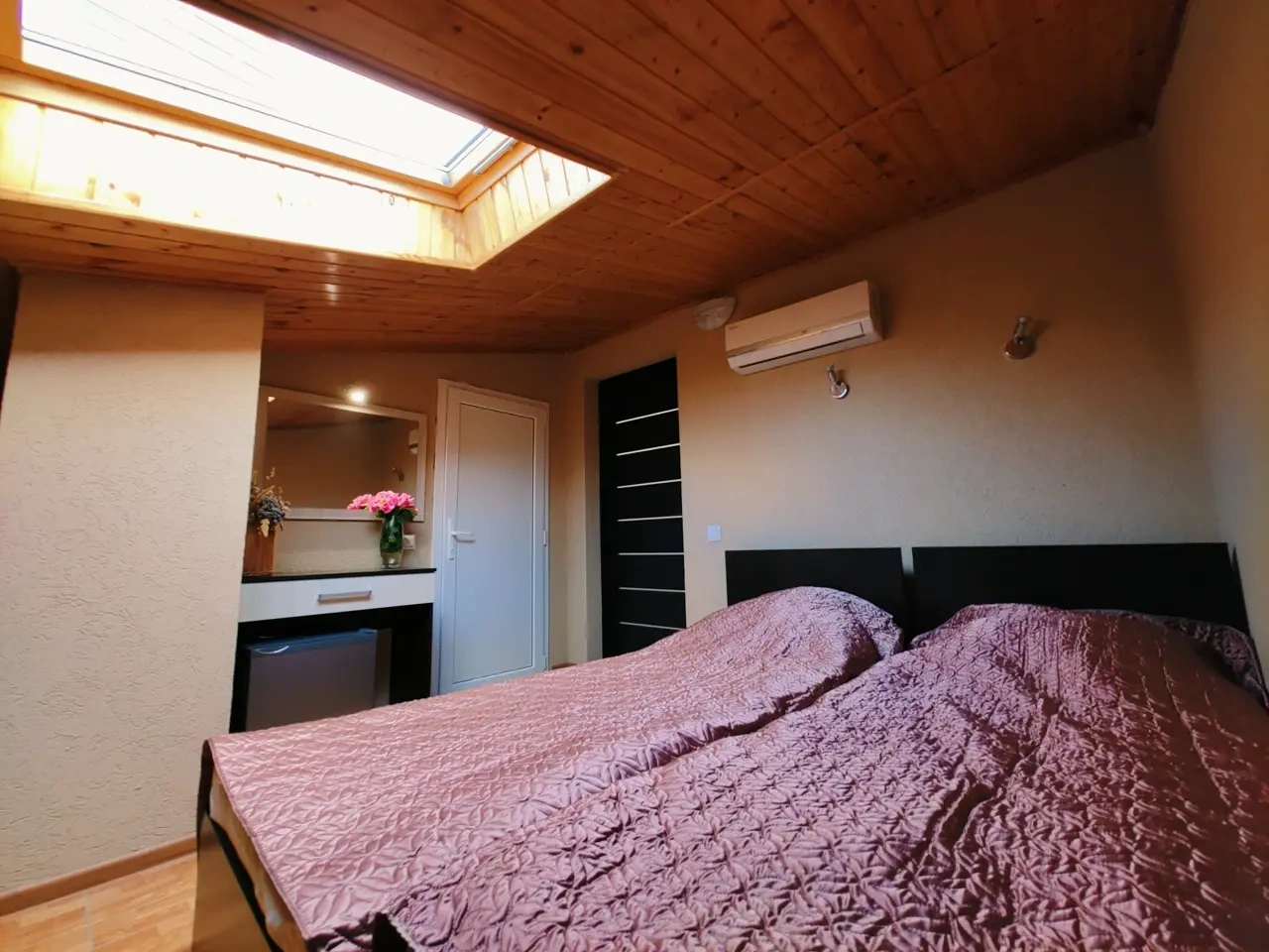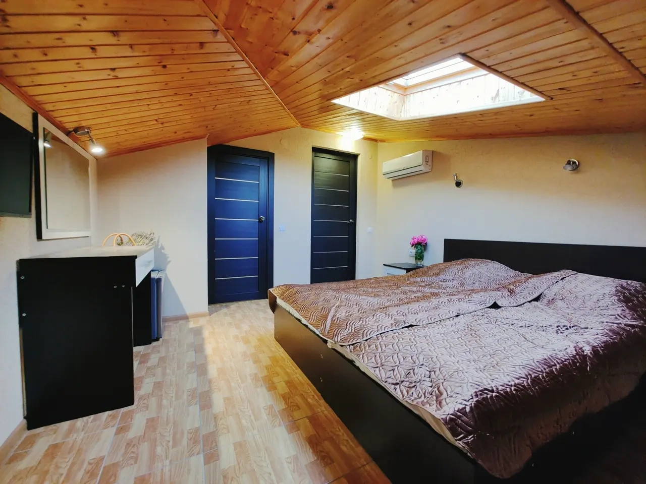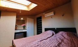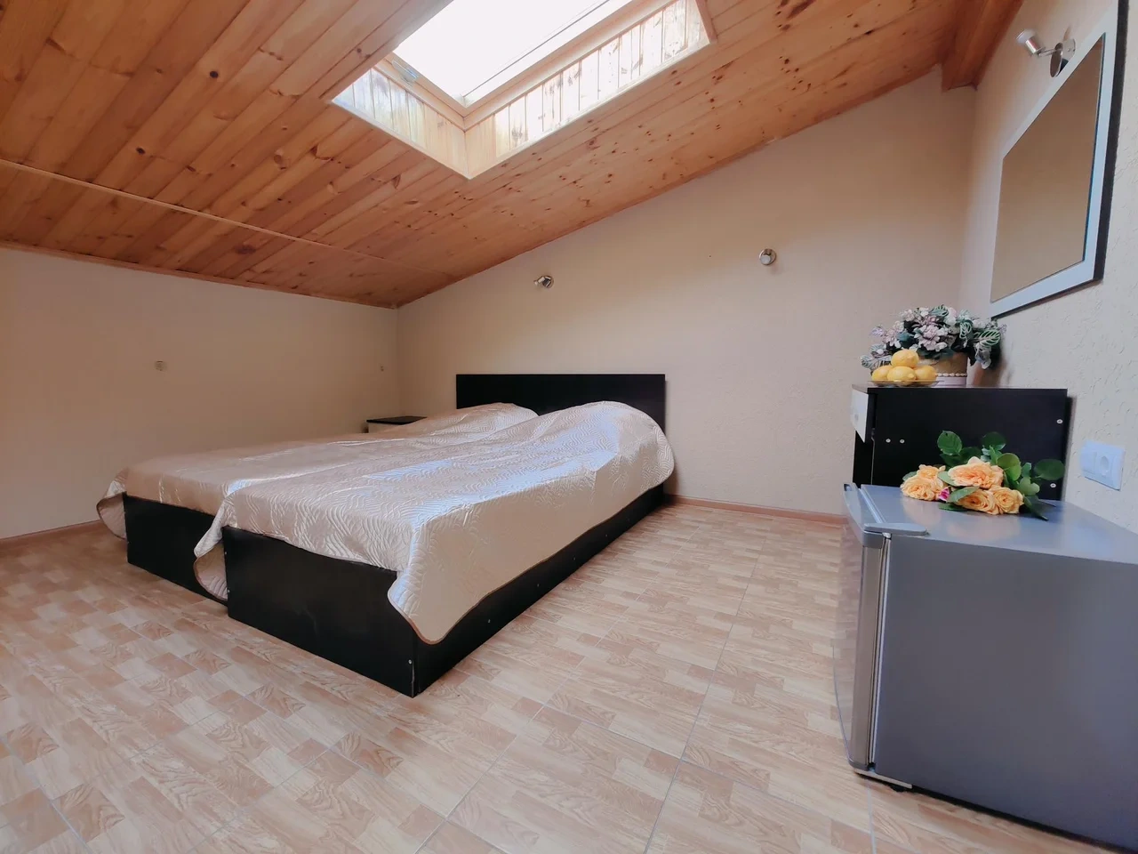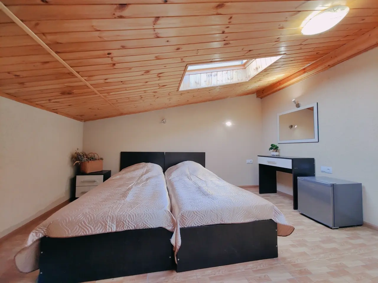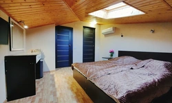Мансардный номер оснащен двумя односпальными кроватями, прикроватными тумбами, журнальным столиком, платяным шкафом, мини-холодильником, телевизором и кондиционером. Ванная комната (душ, туалет, раковина).