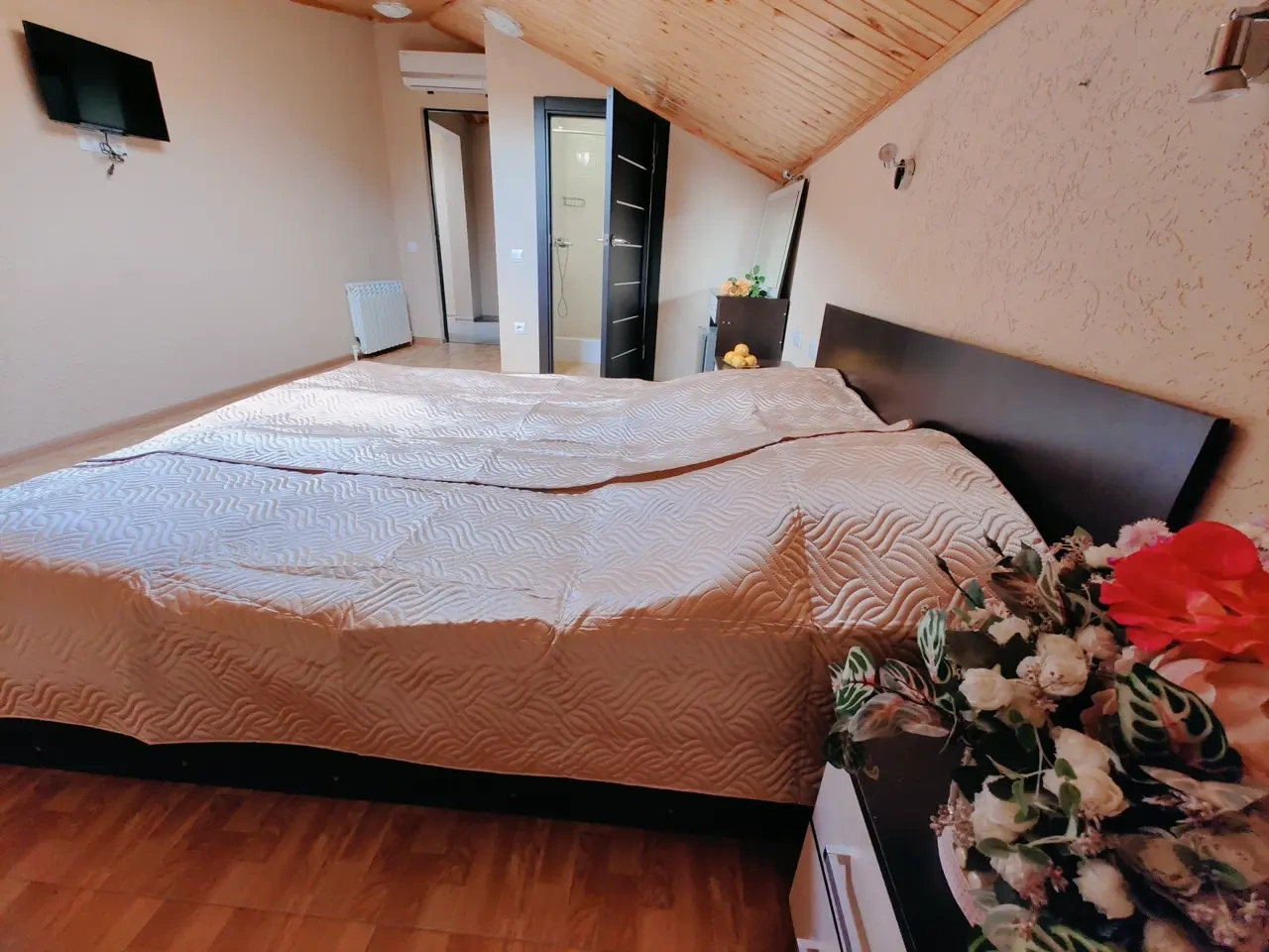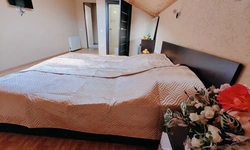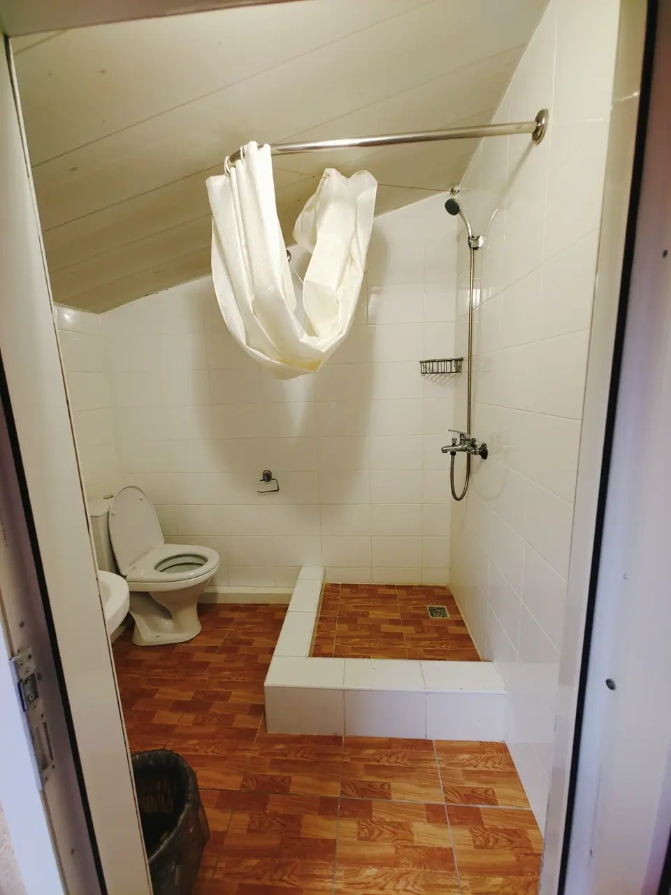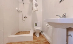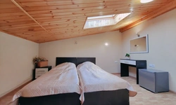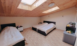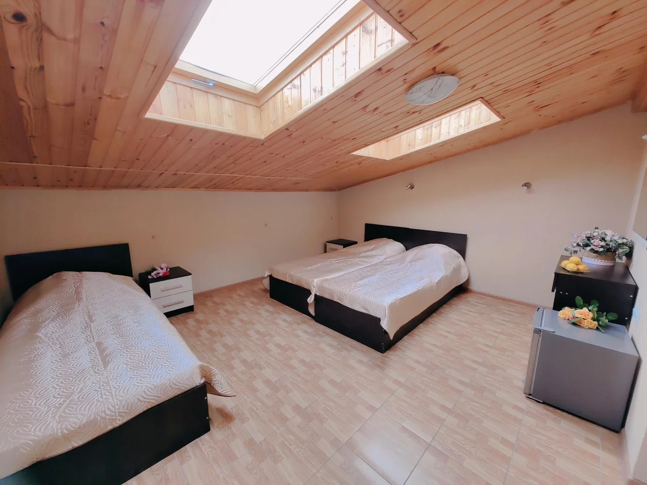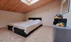 Мансардный номер оснащен тремя односпальными кроватями, прикроватными тумбами, журнальным столиком, платяным шкафом, мини-холодильником, телевизором и кондиционером. Ванная комната (душ, туалет, раковина).