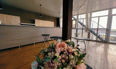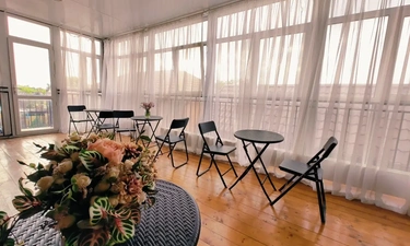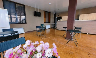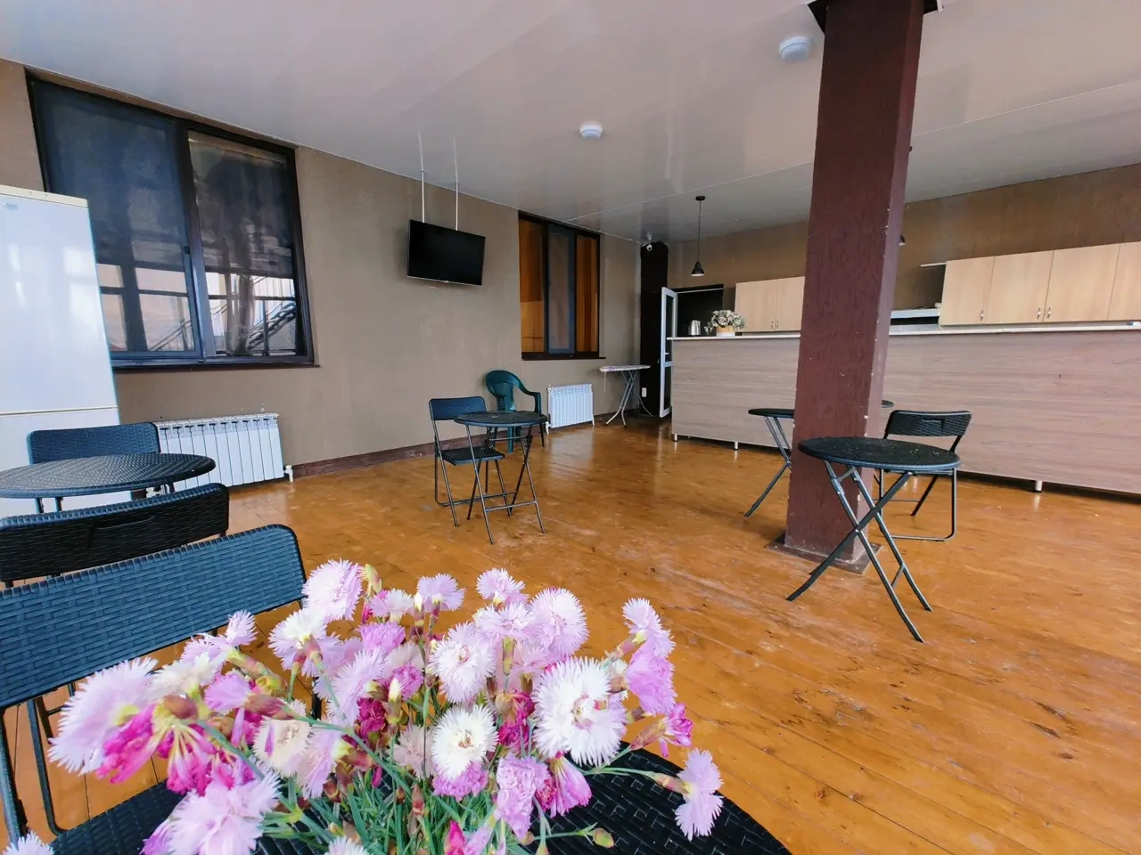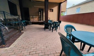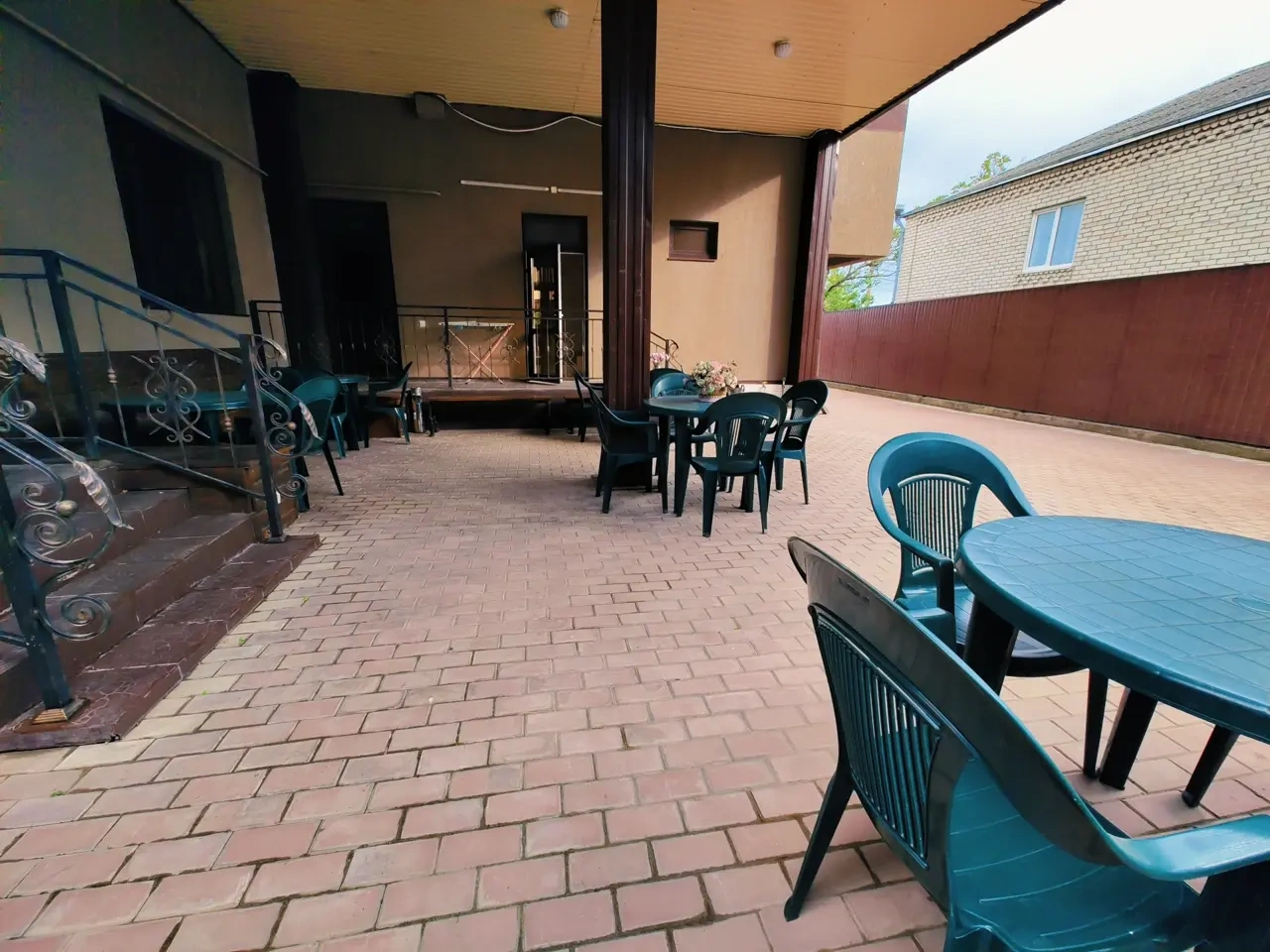 На 2 этаже гостевого дома расположена уютная, просторная, общая кухня, где гости смогут воплотить свои кулинарные идеи. Для этого кухня оснащена всем необходимым: микроволновая печь, электроплита, чайник, духовой шкаф, набор необходимой посуды и столовые приборы. На территории кухни есть зона со столиками и стульями для приема пищи и отдыха в любую погоду.