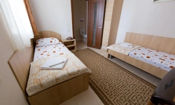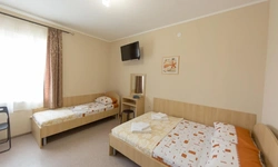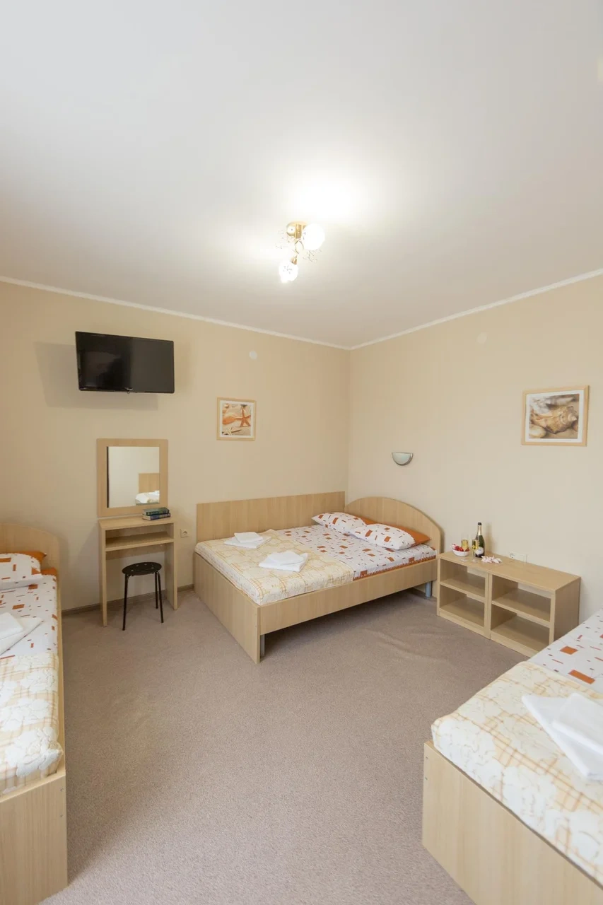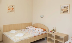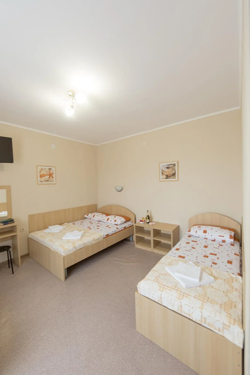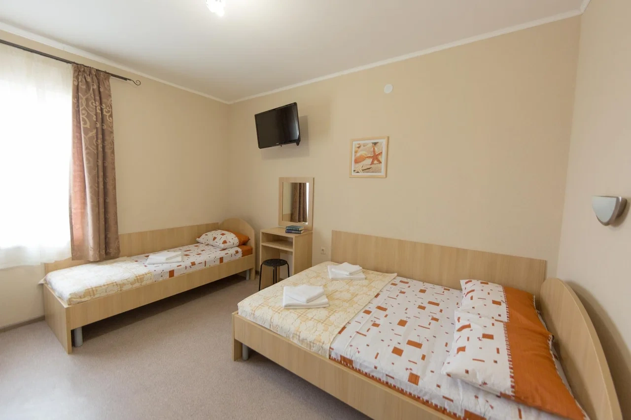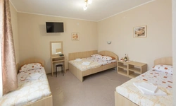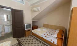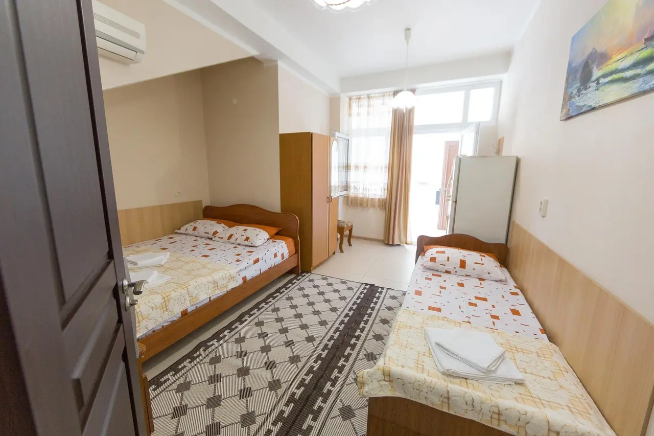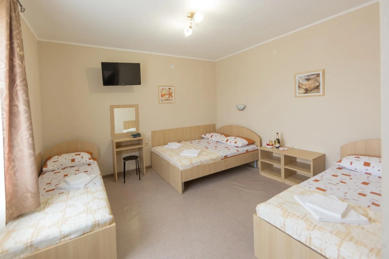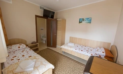 Трехместный номер с удобствами, с выходом на большую террасу со столиками. Чисто, белые полотенца. Немного не хватало чайника в номере, но есть общая кухня со множеством чайников. Но это так, придирка. Рядом очень вкусная и недорогая столовая в отеле Мария. Но работает то кафе лишь летом. С удовольствием посетил бы еще.