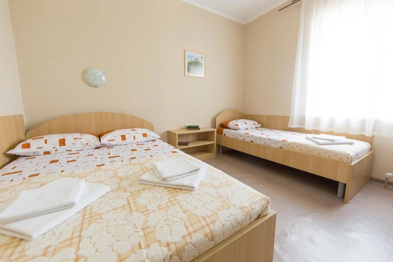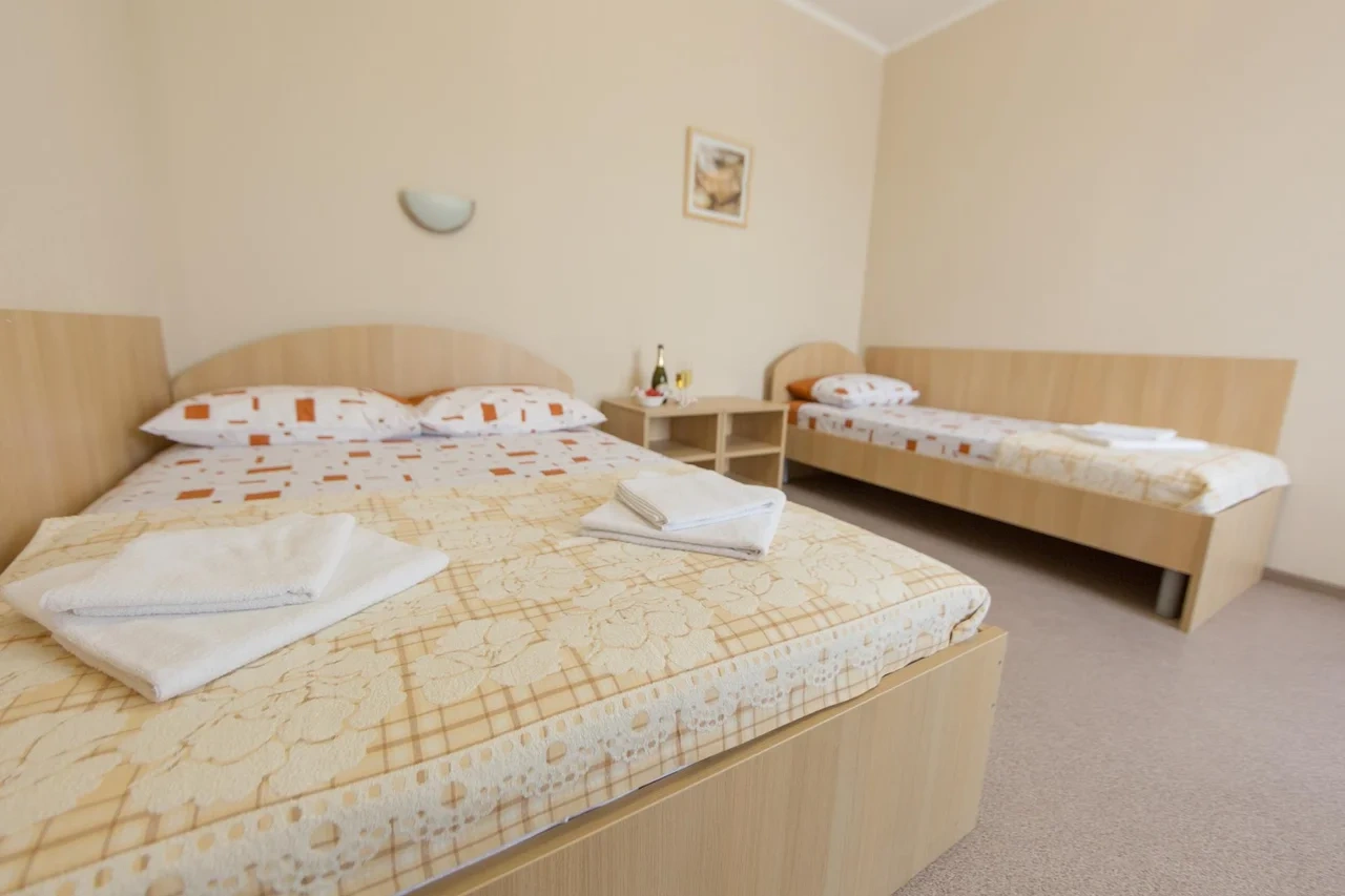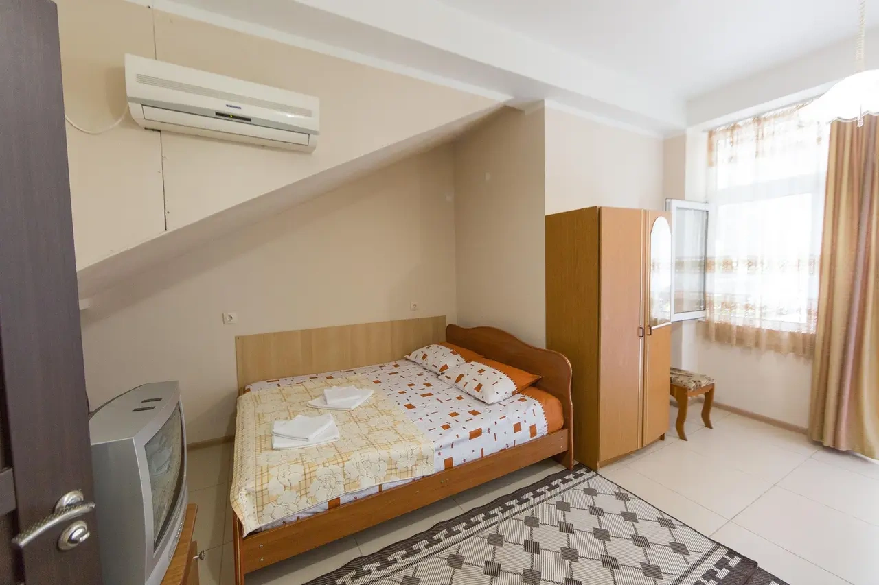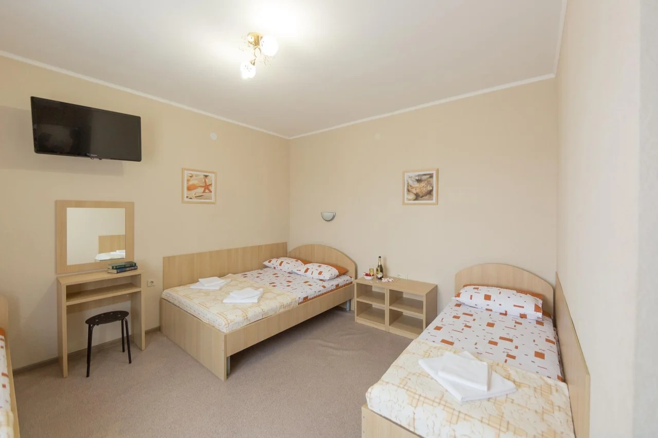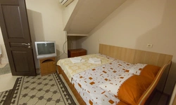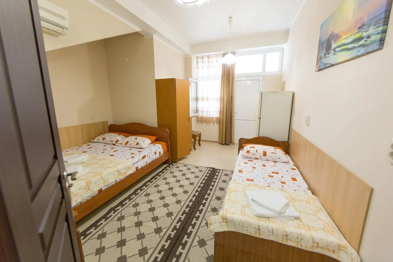 Трехместный номер с удобствами, с выходом на большую террасу со столиками. Чисто, белые полотенца. Немного не хватало чайника в номере, но есть общая кухня со множеством чайников. Но это так, придирка. Рядом очень вкусная и недорогая столовая в отеле Мария. Но работает то кафе лишь летом. С удовольствием посетил бы еще.