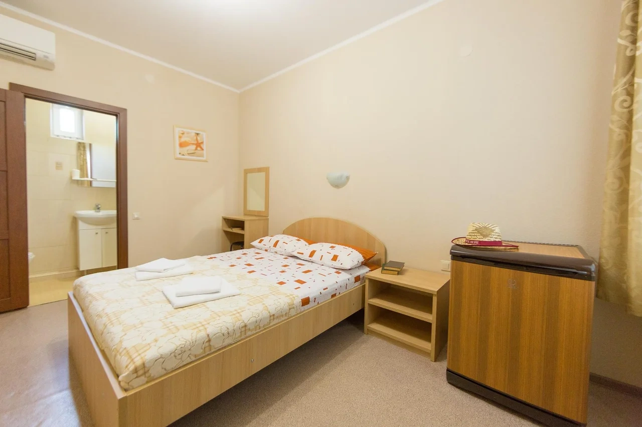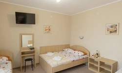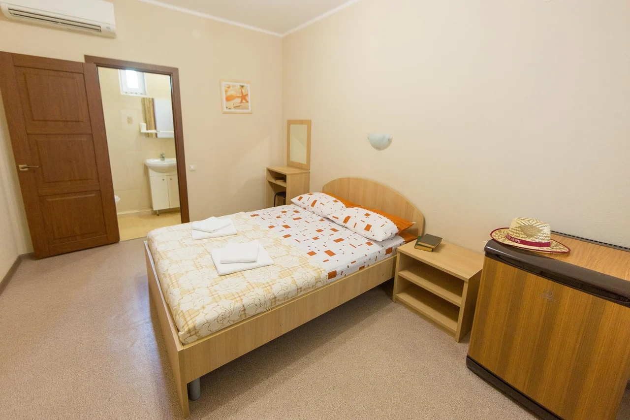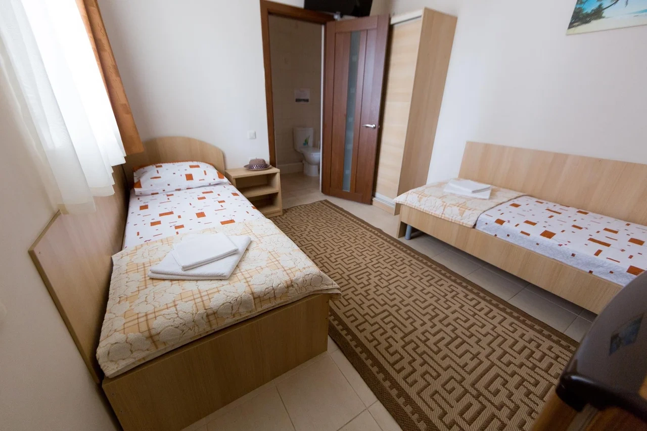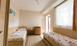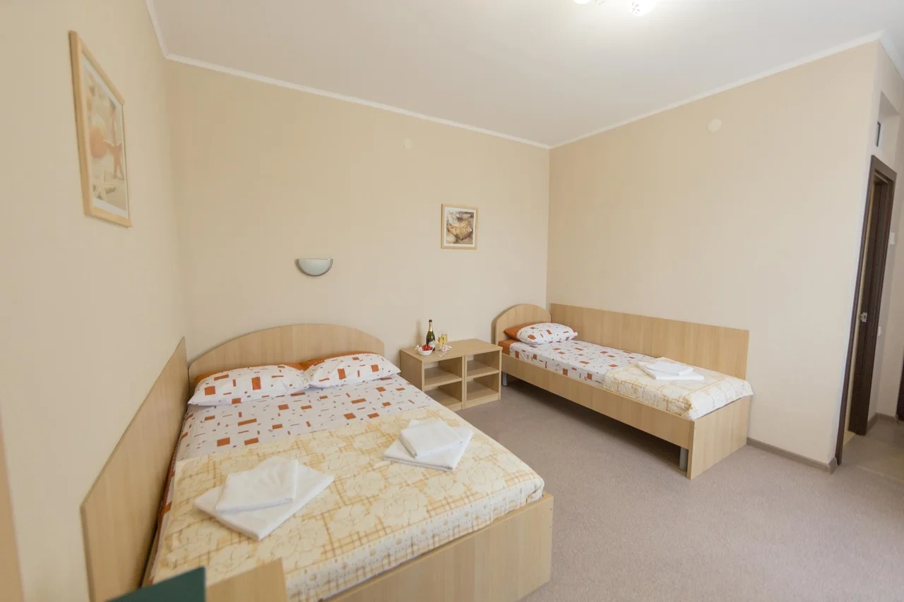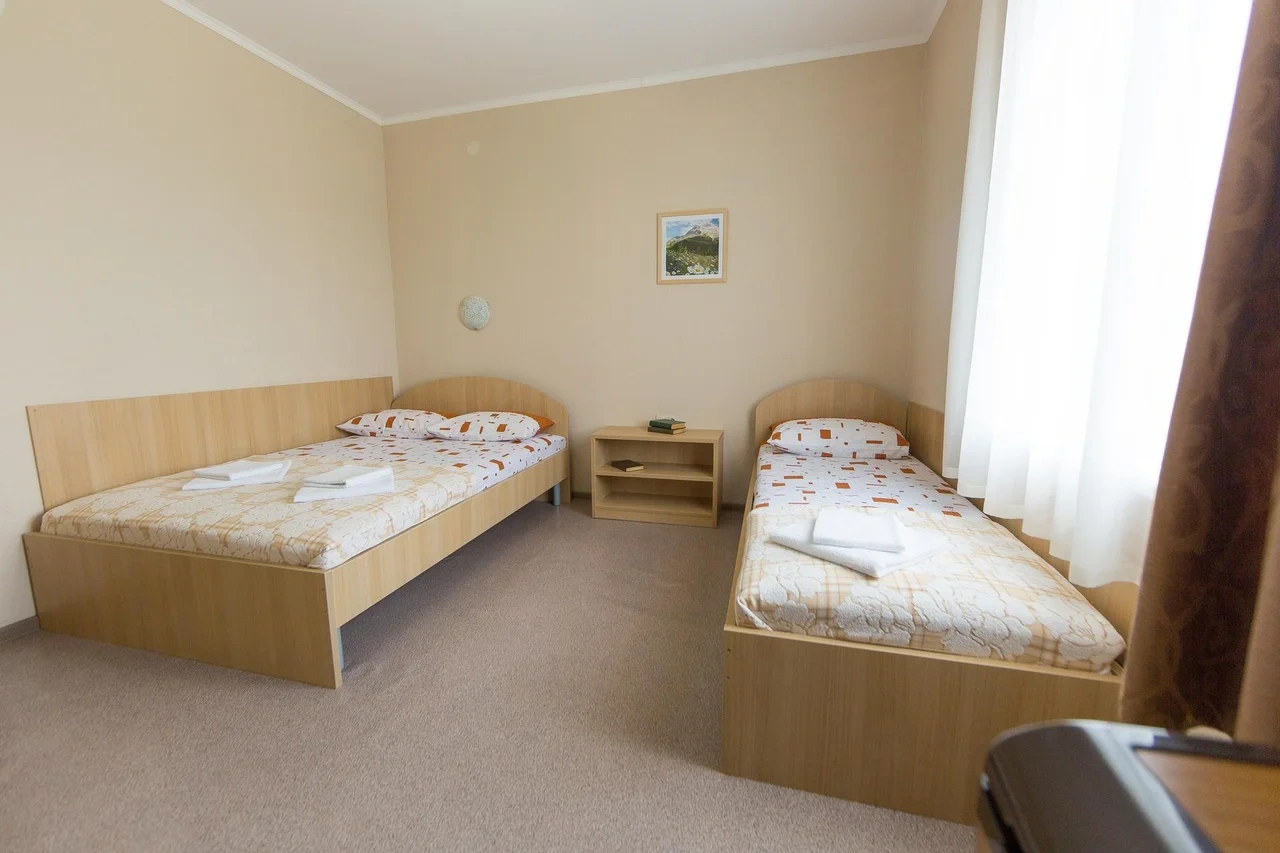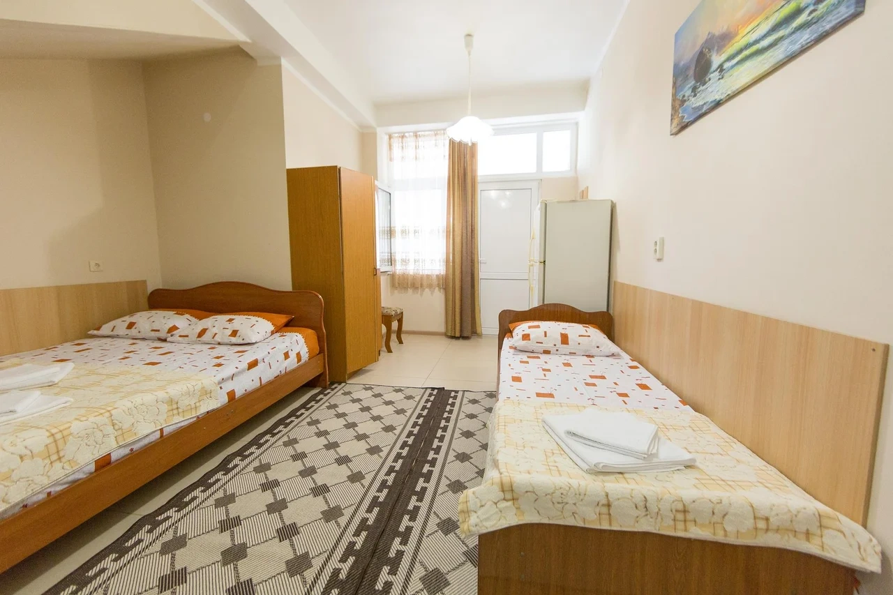 Трехместный номер с удобствами, с выходом на большую террасу со столиками. Чисто, белые полотенца. Немного не хватало чайника в номере, но есть общая кухня со множеством чайников. Но это так, придирка. Рядом очень вкусная и недорогая столовая в отеле Мария. Но работает то кафе лишь летом. С удовольствием посетил бы еще.