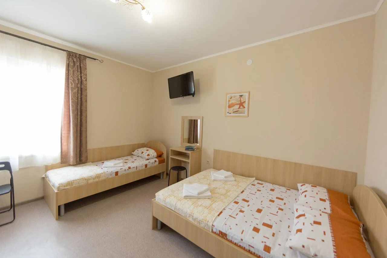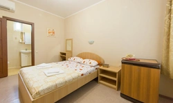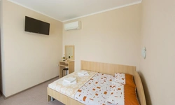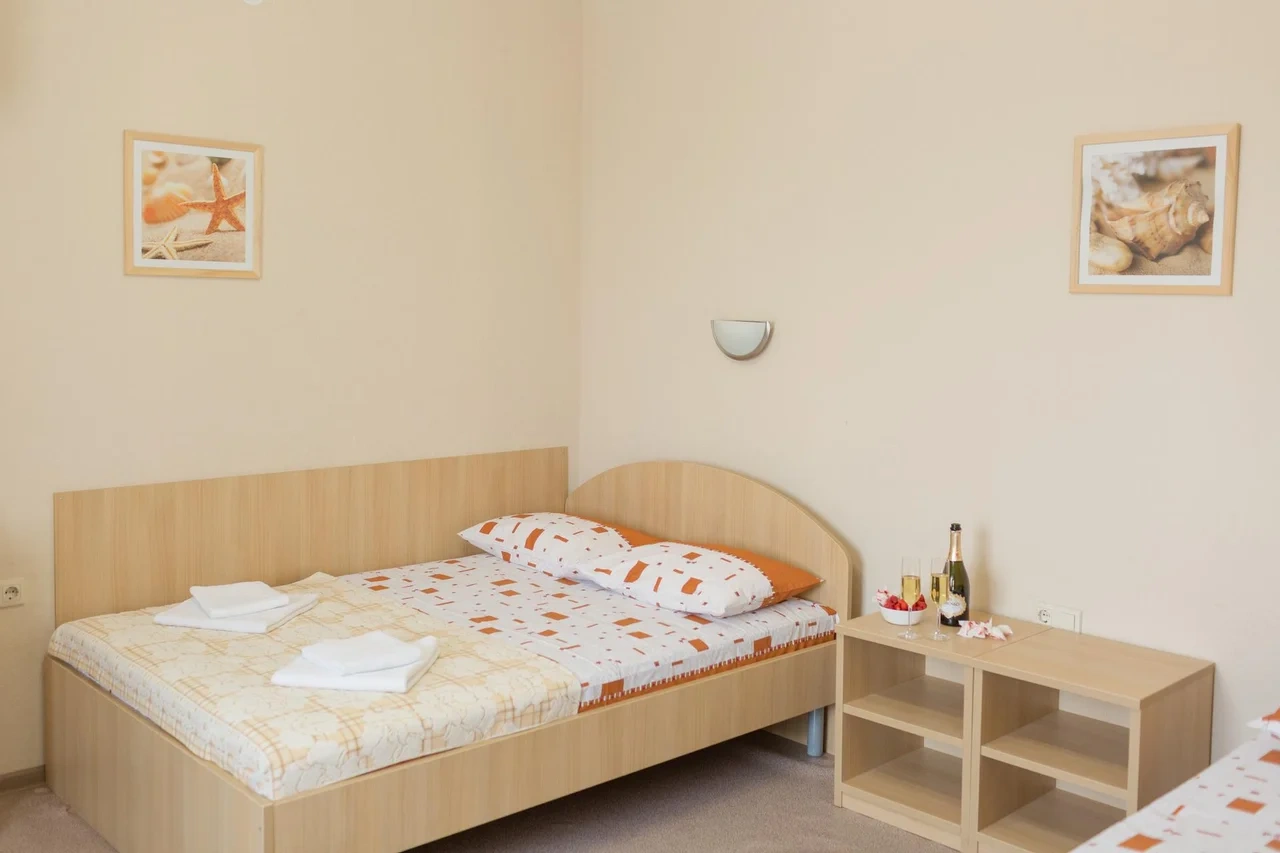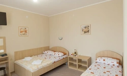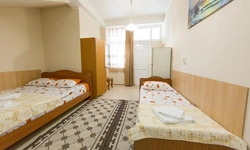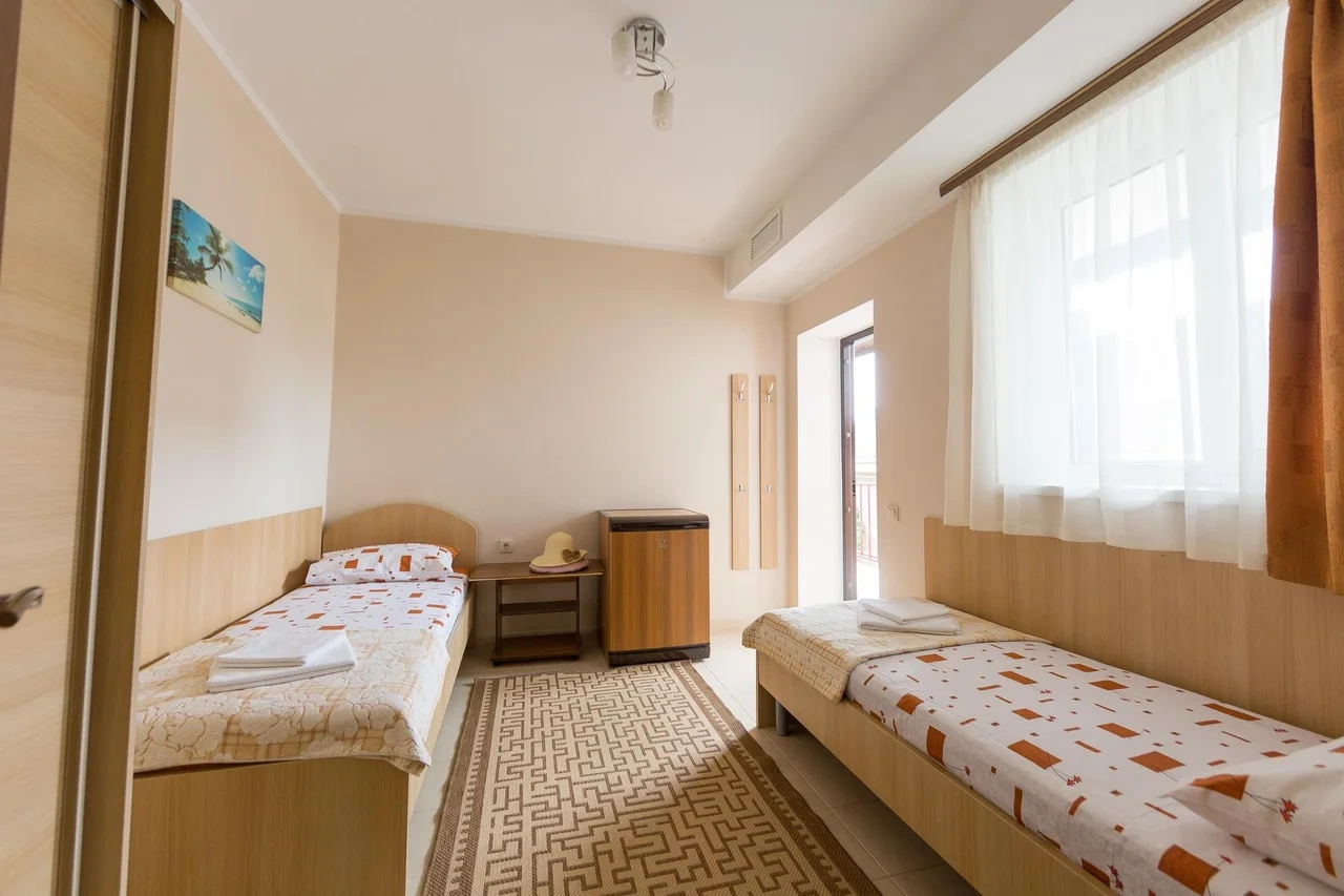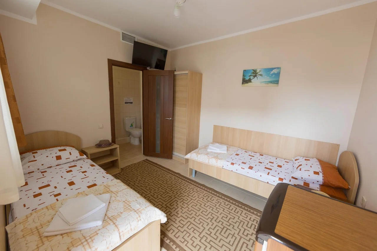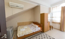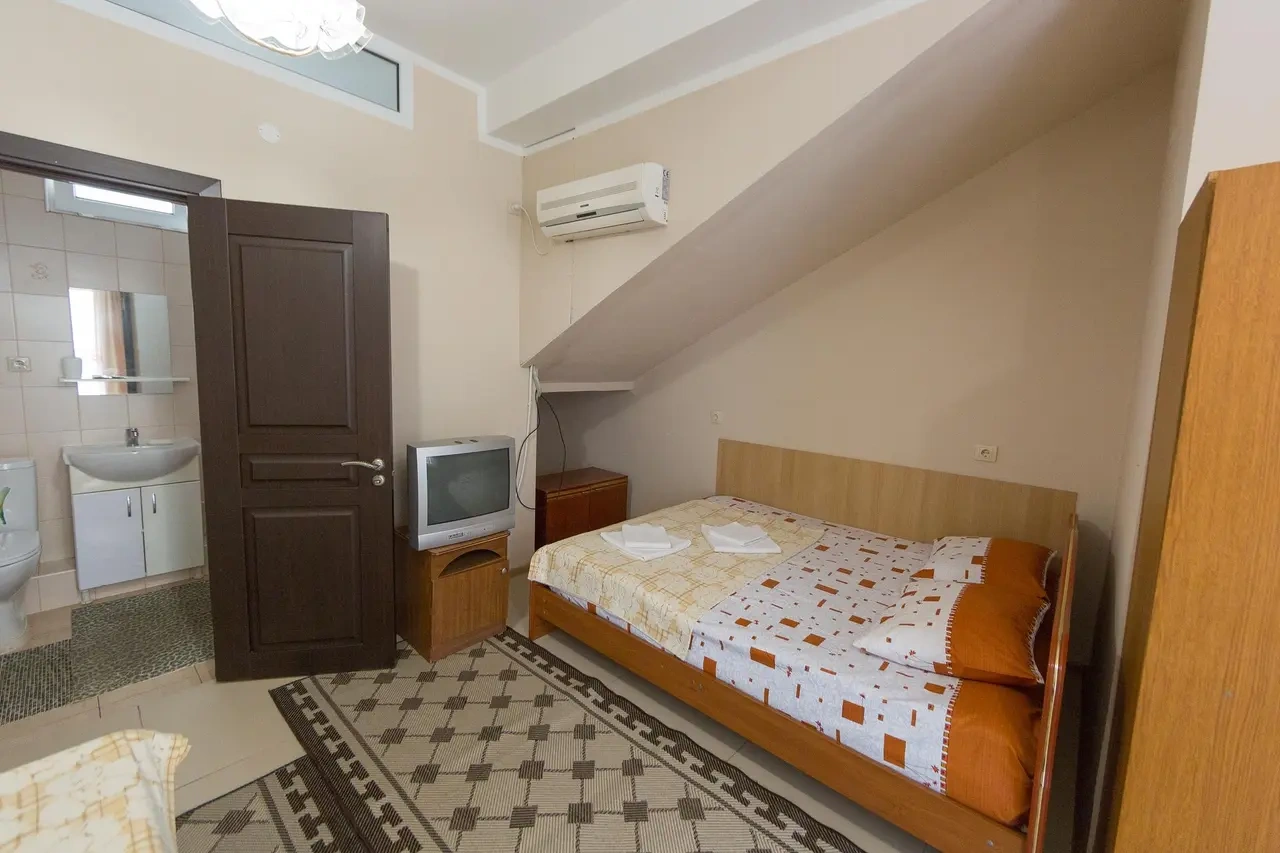 Трехместный номер с удобствами, с выходом на большую террасу со столиками. Чисто, белые полотенца. Немного не хватало чайника в номере, но есть общая кухня со множеством чайников. Но это так, придирка. Рядом очень вкусная и недорогая столовая в отеле Мария. Но работает то кафе лишь летом. С удовольствием посетил бы еще.