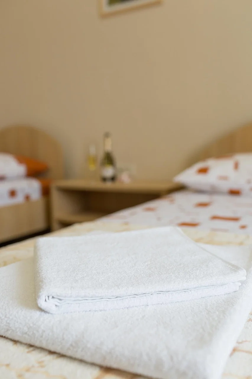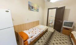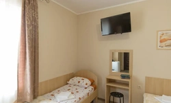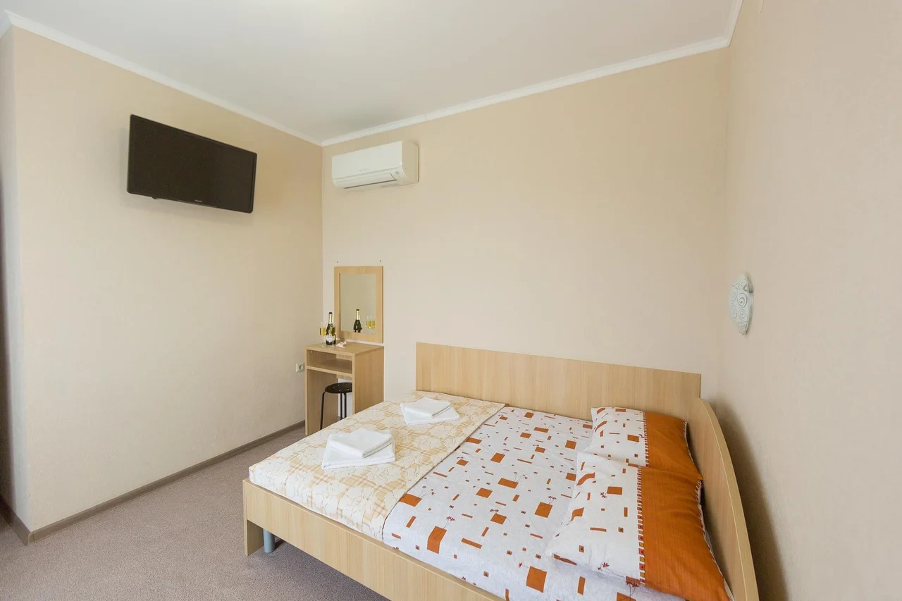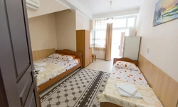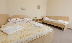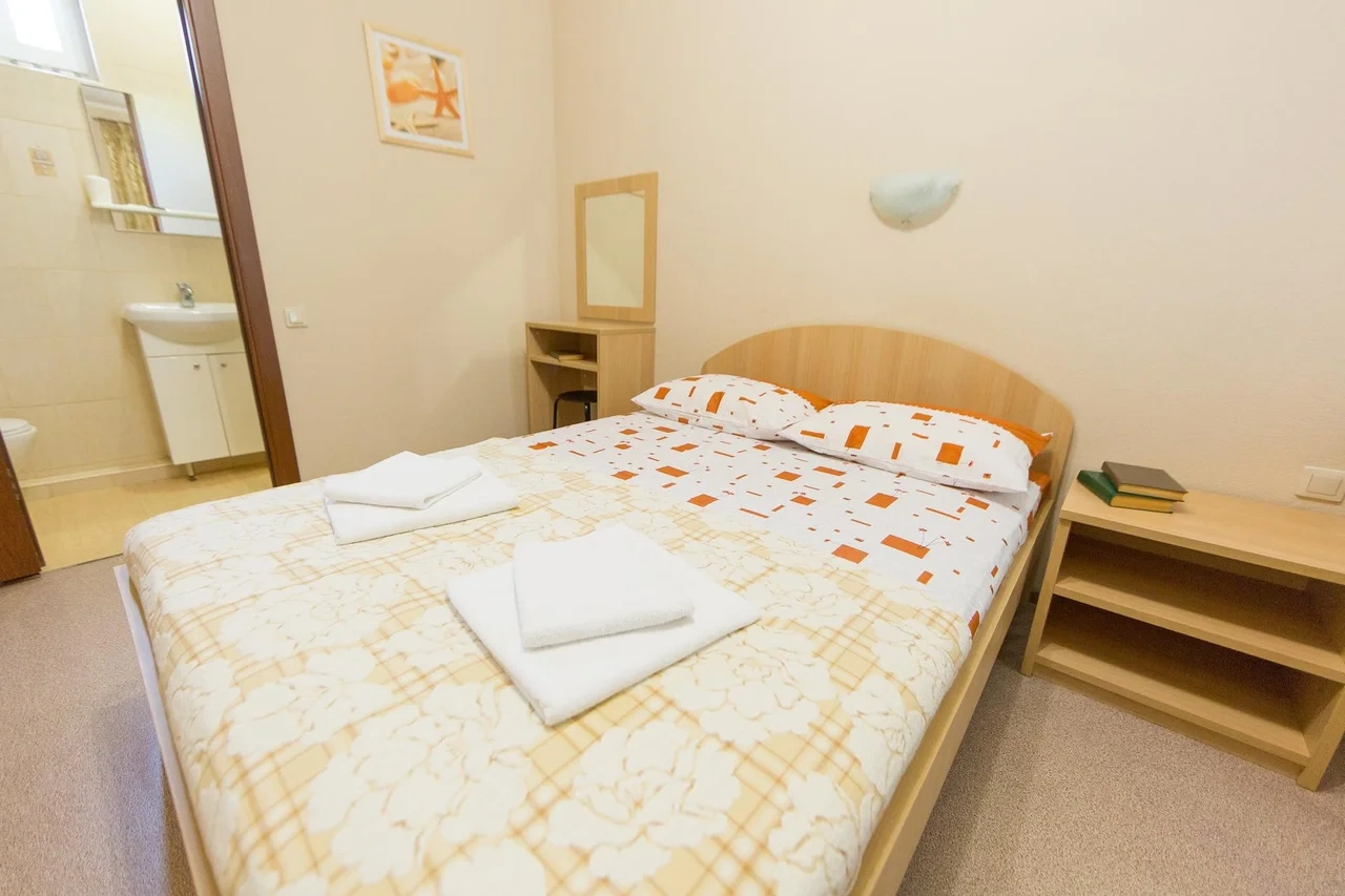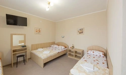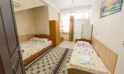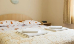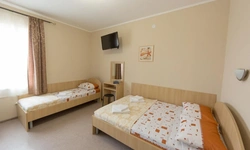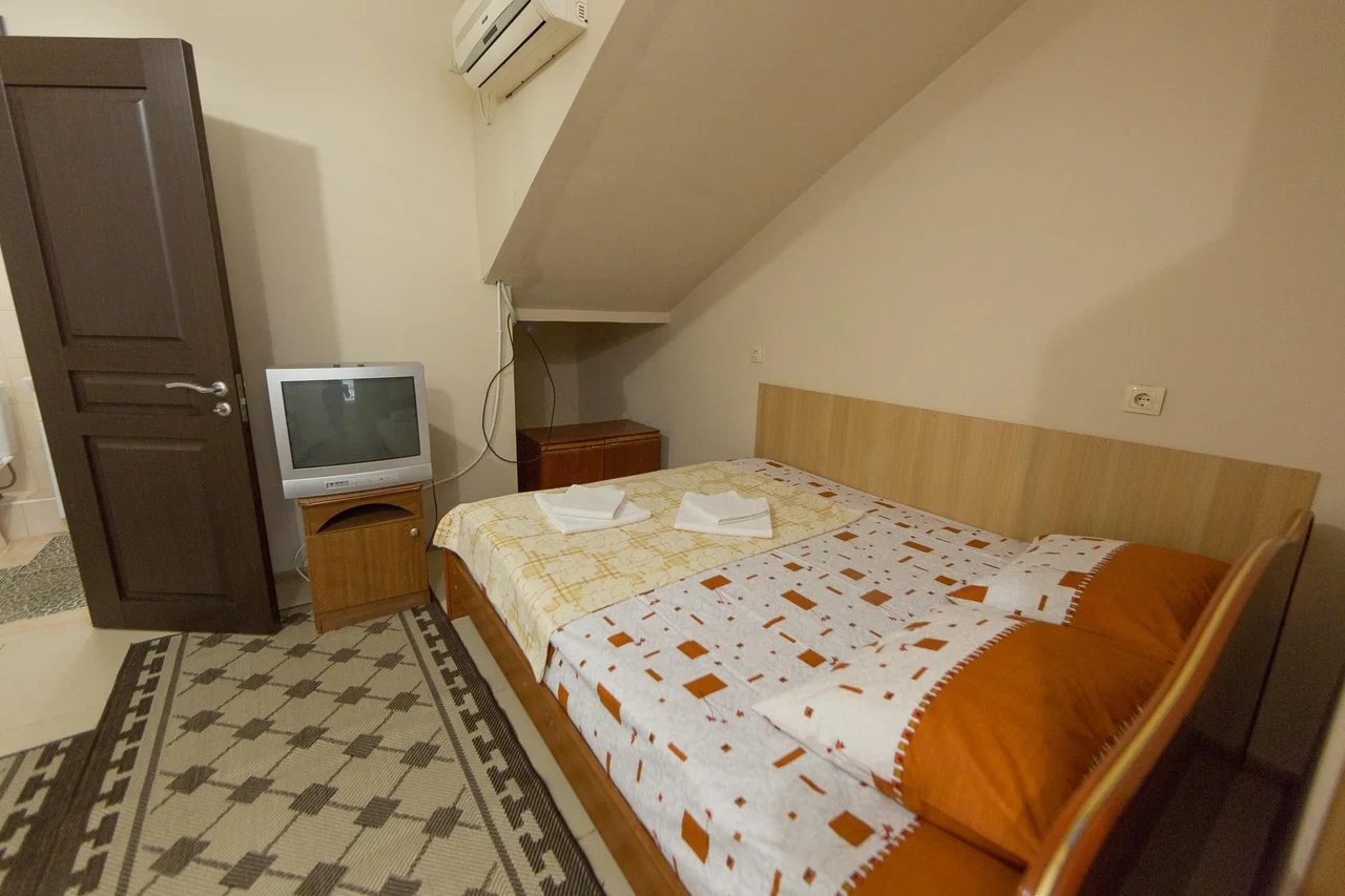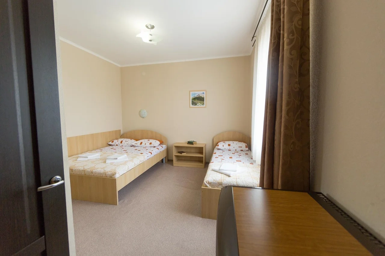 Трехместный номер с удобствами, с выходом на большую террасу со столиками. Чисто, белые полотенца. Немного не хватало чайника в номере, но есть общая кухня со множеством чайников. Но это так, придирка. Рядом очень вкусная и недорогая столовая в отеле Мария. Но работает то кафе лишь летом. С удовольствием посетил бы еще.